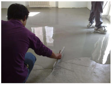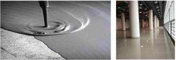 調(diào)配好的呈流體狀,具備良好的流動(dòng)性,不需要像水泥砂漿找平多重振搗抹壓,倒在需要找平的地面上通過(guò)自流平耙子輔助加快材料自然流平。